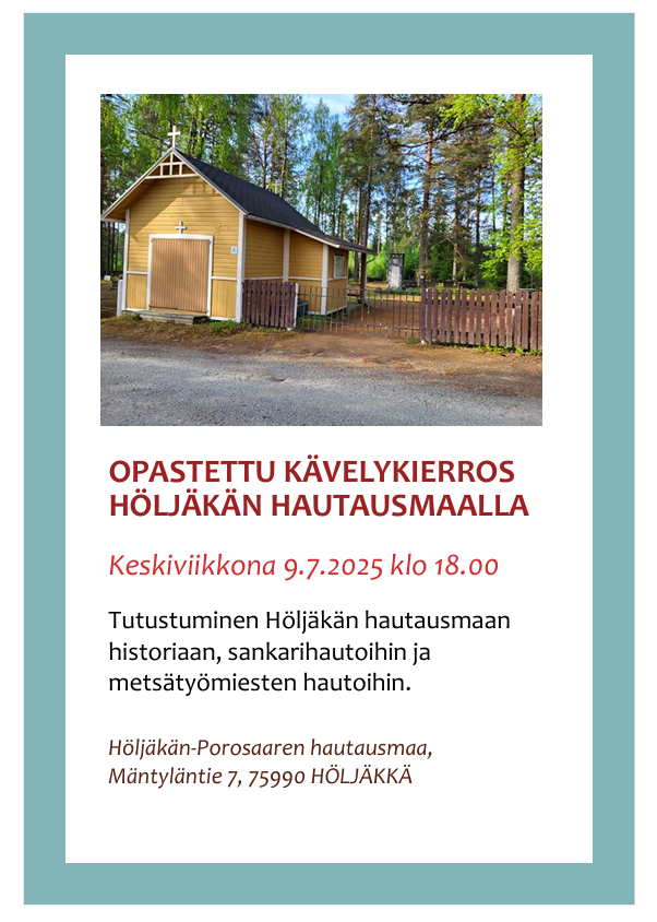 Höljäkän hautausmaalla järjestettiin opastettu kävelykierros keskiviikkona 9.7.2025. Kierroksen aikana tutustuttiin hautausmaan historiaan, sankarihauta-alueeseen ja metsätyömiesten hautoihin. Oppaina toimivat Leena Eskelinen ja Anu Kyllönen.
