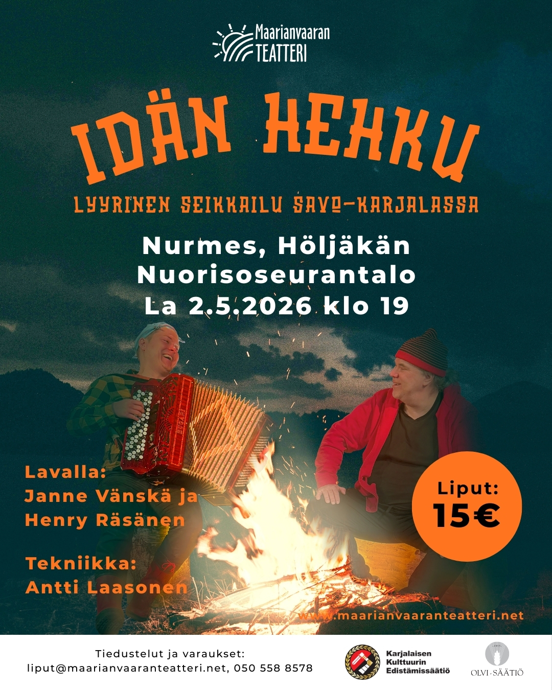 Teatteriesitys Idän Hehku esitetään Höljäkän nuorisoseurantalolla lauantaina 2.5.2026 klo 19. Tämä Maarianvaaran teatterin uusi näyttämöteos on muusikko Janne Vänskän, näyttämötaiteilija Henry Räsäsen ja esitysteknikko Antti Laasosen lyyrinen vaellus kohti itäsuomalaisuuden ydintä. Esitys seuraa idän miehen seikkailua Savon ja Karjalan rajamailla. Vaelluksensa aikana hän etsii itseään ja yhteyttä toiseen ihmiseen maiseman, kielen ja mytologian kautta.