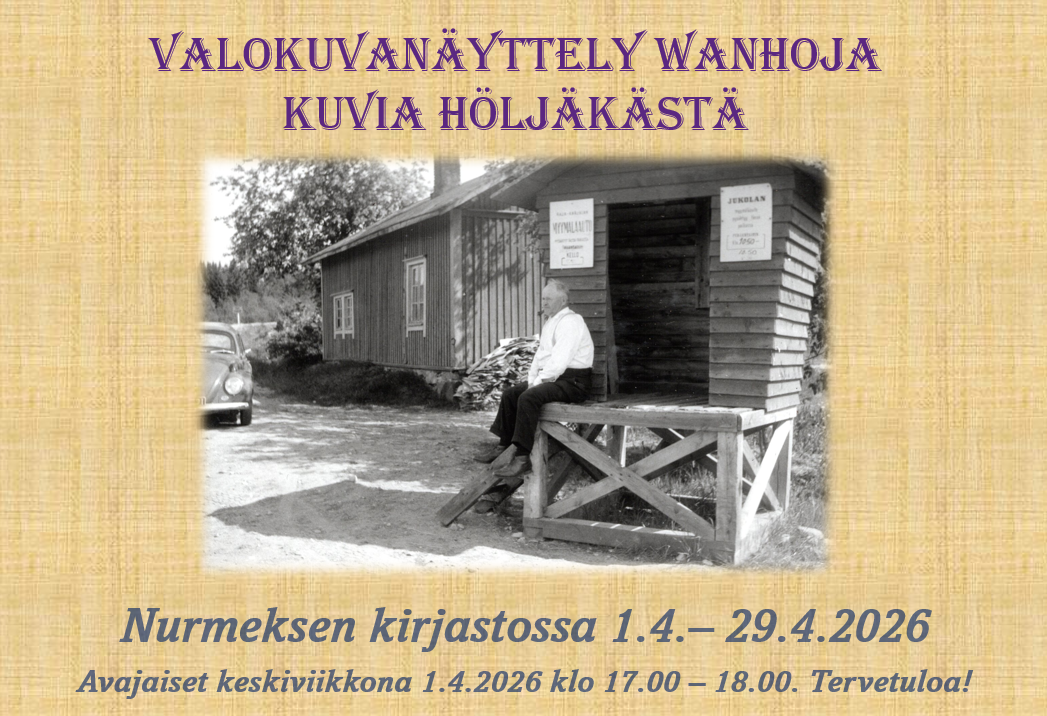 Valokuvanäyttely "Wanhoja kuvia Höljäkästä" on esillä Nurmeksen kirjastossa huhtikuun 2026 ajan. Näyttely koostuu valokuvista, jotka olivat mukana kesän 2025 valokuvanäyttelyssä Höljäkän nuorisoseurantalolla. Tervetuloa näyttelyn avajaisiin keskiviikkona 1.4.2026 klo 17 alkaen!